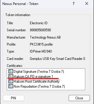 Ukoliko je prikazana digitalna potvrda sa nazivom “Halcom CA PO e-signature …” ili“Halcom CA FO e-signature …”,imate kvalifikovanu potvrdu koja ima mogućnost rada na poslovima sa državnom upravom.