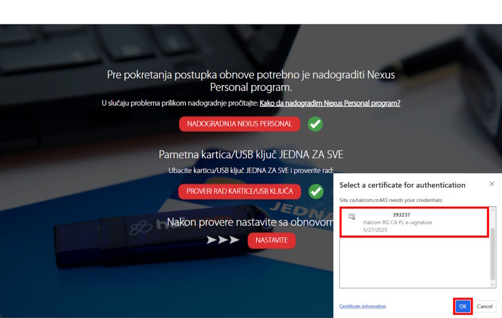 Zatim kliknite na opcjiu PROVERI RAD KARITCE/USB KLJUČA, u dodatnom prozoru izaberite sertifikat koji želite da obnovite i unesite PIN kod.
