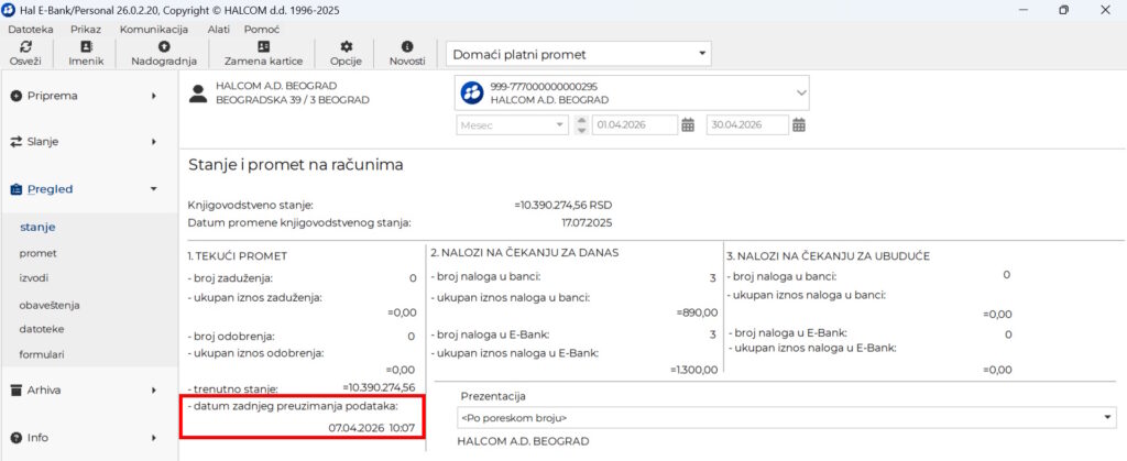 Vreme poslednjeg preuzimanja podataka koje je banka prosledila je prikazano u mapi Pregled > Stanje, na dnu kolone Tekući promet.