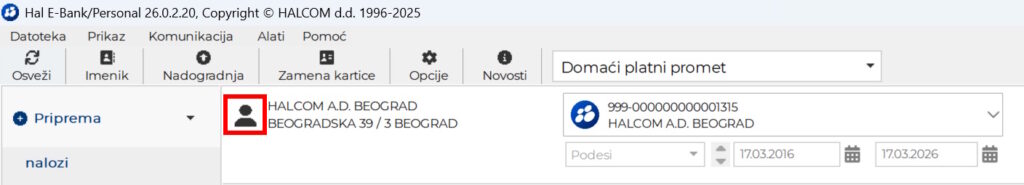 Kliknite na ikonicu koja se nalazi levo od naziva preduzeća. Otvoriće se prozor Podaci o vlasniku računa i ovlašćeniku za izabrani račun.