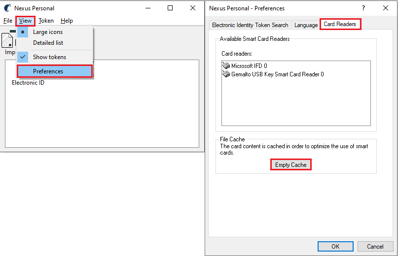 Ali sem uspešno obnovil digitalno potrdilo? Referenčna št. 1076 Ogledov: 28164 Domov / FAQ / Ali sem uspešno obnovil digitalno potrdilo? Preverite ali je vaše digitalno potrdilo uspešno obnovljeno: 1 Zaženite program Nexus Personal (v meni Start vnesite Nexus). Odprite Nexus Personal s klikom na ikono v menijski vrstici. 2 Kliknete na View – Preferences – Card Readers – Empty Cache. 3 Pojavi se novo okno, da ste uspešno pobrisali pomnilnik, potrdite s klikom na OK. 4 Vaše digitalno potrdilo je uspešno obnovljeno, v kolikor sta v oknu vidna Digital Signature – 2 in Non Repudiation – 2.