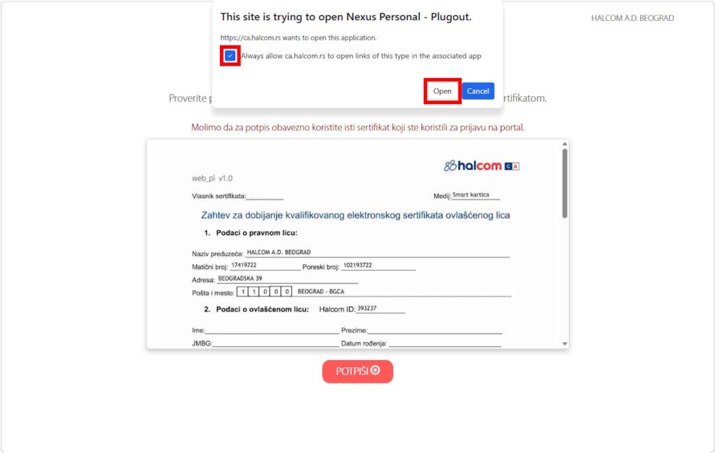 Then click on the option PROVERI RAD KARITCE/USB KLJUČA, and in the additional window select the certificate you want to renew and enter the PIN code.